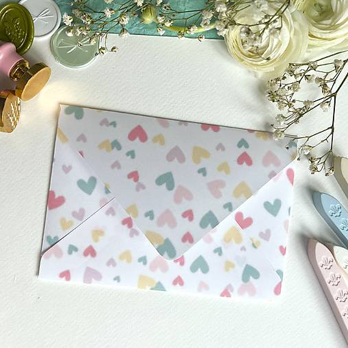 ❤ Ako sen krásna papierová obálka s maľovaným motívom pastelových srdiečok.